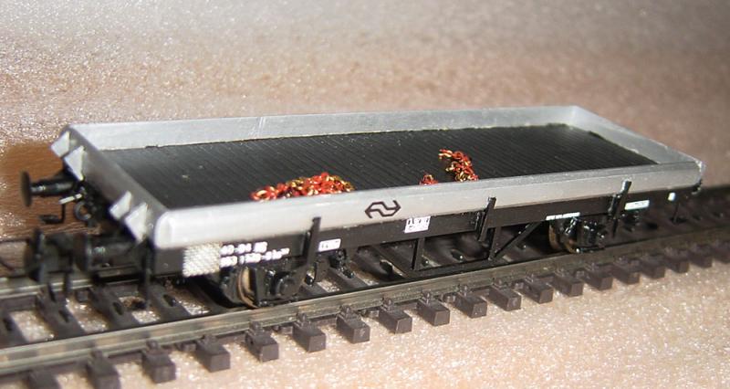 Als ik het zo bekijk zijn heeft kleiNSpoor zelf de Kls wagon van Roco genomen en deze iets aangepast. De rongenhouders zijn verdwenen en het onderste deel van de zijkanten zijn zwart gespoten.