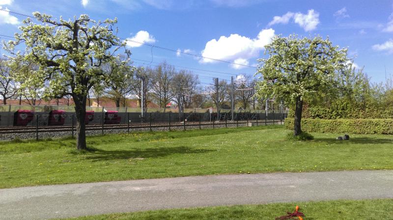 Harley vond het te warm gisteren en hij weet zo langzamerhand dat ik daar even drie foto's met mijn mobiel moet maken. Ik ben deze twee perenbomen aan het volgen (iedere week een foto) om te kijken hoe ze zich door het jaar heen gaan gedragen.