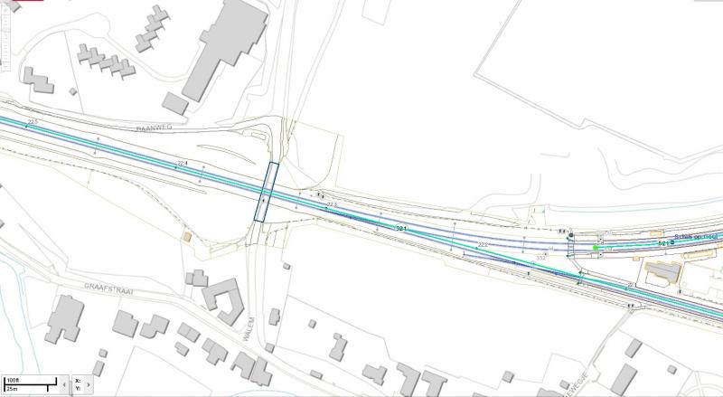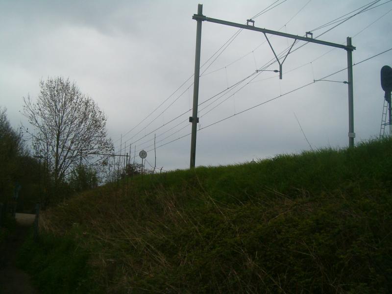 Baanweg Schin op Geul - de overwegaankondiging is voor het overpad in Sog en de kilometrering aan het bovenleidingportaal is van Aken - Maastricht.
