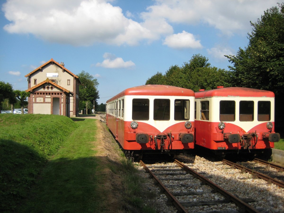 Er staat een rood duo Franse "railbussen"