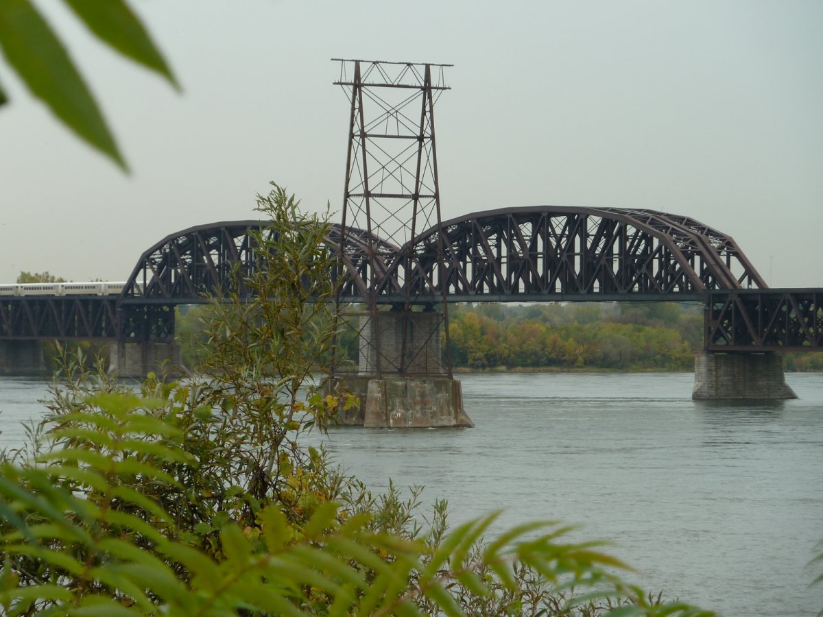 Nou je staat hier op boulevard de la Salle in laSalle een stadsdeel van Montreal, waarschijnlijk onder of erg in de buurt van de Mercier Bridge en je kijkt naar de CP railbrug over de Saint-Lawrence Rivier waar net een commuter trein overheen rijdt.