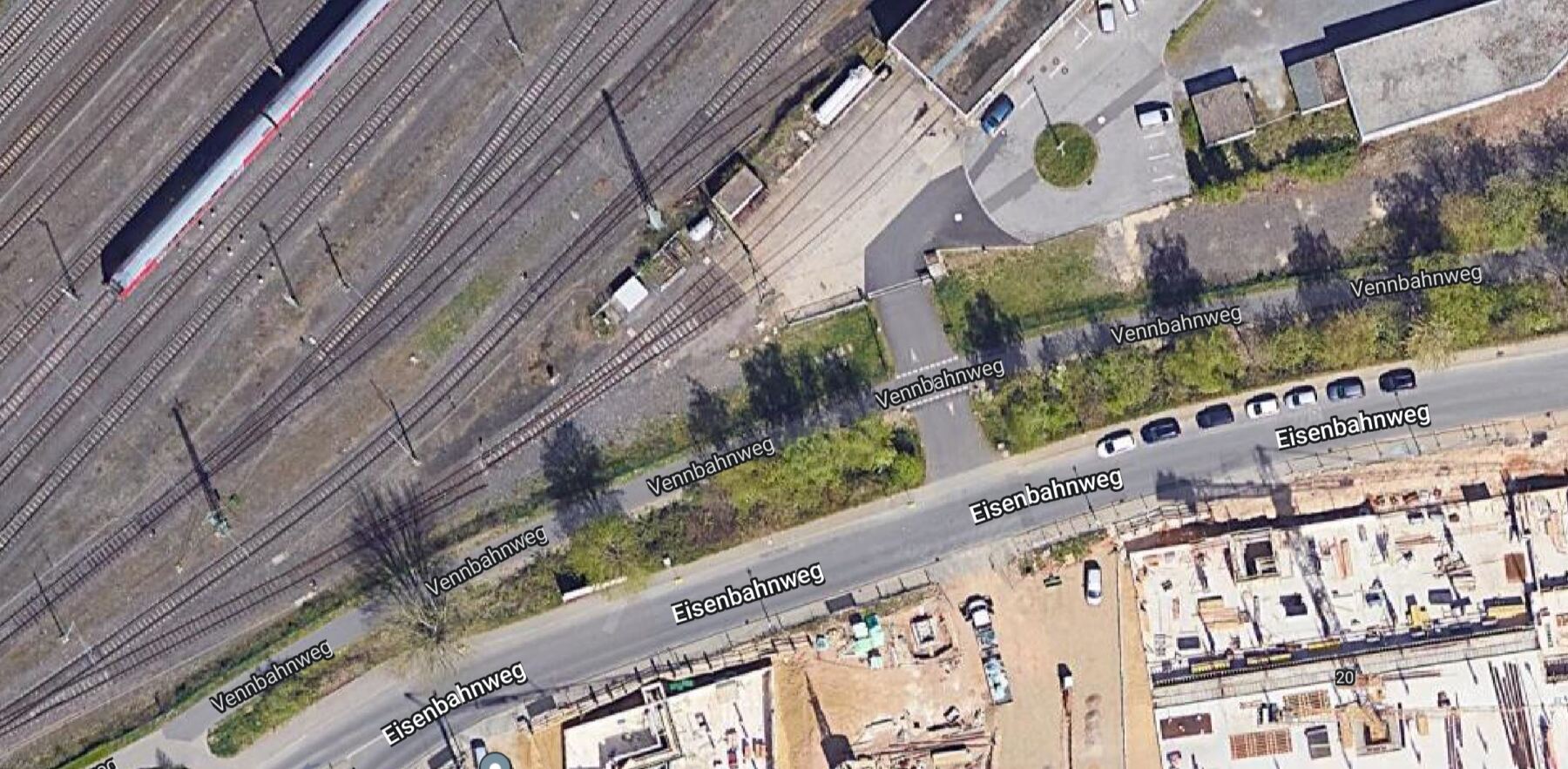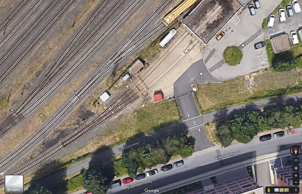 Omdat ik een foto had gevonden van de 690 001-3 samen met de 690 501-2 bij de RWTH in Aachen West ben ik verder gaan zoeken rond de Aachener stations. Tussen station Rothe Erde en het rangeerterrein zag ik iets roods, maar hij gebrek aan Streetview kon ik de gebouwen niet 'plaatsen'.