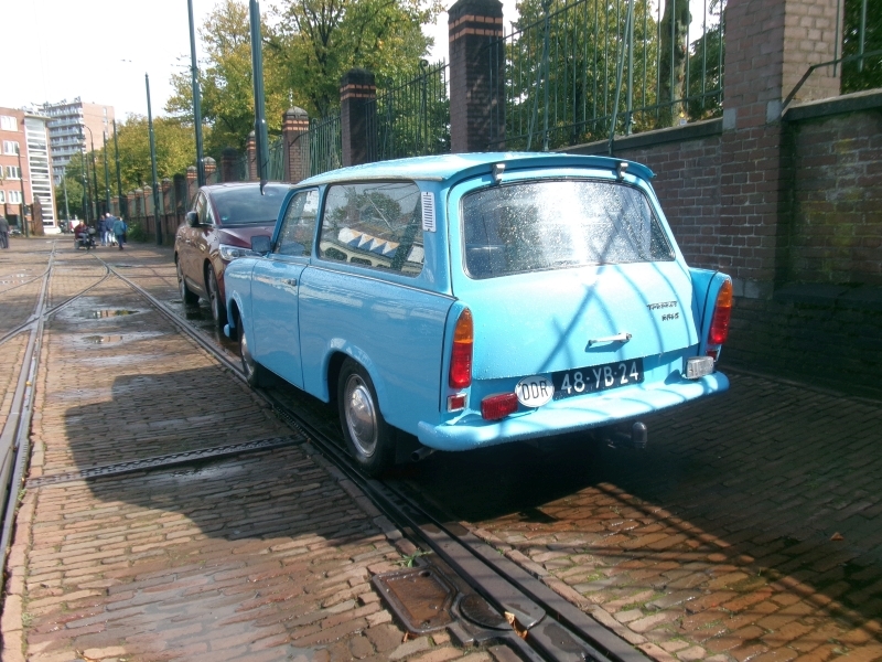 Het muurtje/hekwerk naast de Trabant staat langs de Parallelweg in Den Haag.