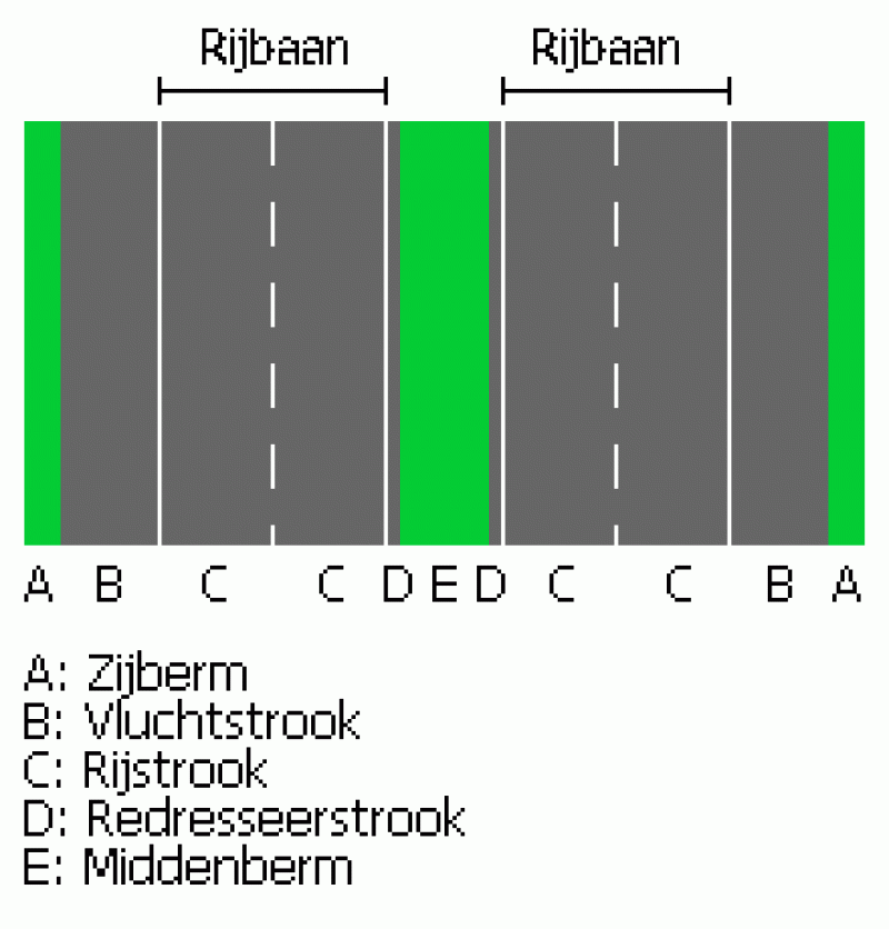 Even snel rekenen, dat is (minimaal!) 2x2 rijstroken = 4 cm breedte per rijstrook, een middenberm, met aan weerszijden een vluchtstrook van eveneens 4 cm (en dan heb ik het nog niet eens over spitsstroken met vluchthavens) en tenslotte zijbermen, dan kom ik op zegge en schrijven op zo'n 34 cm breedte voor een realistische Nederlandse snelweg...