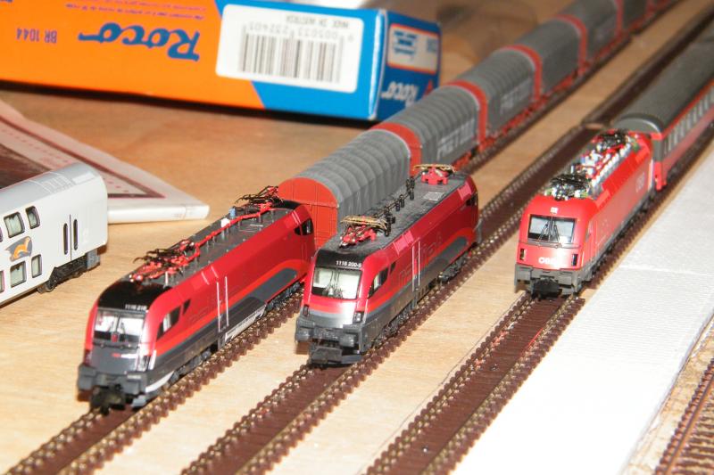 Op de onderstaande foto zie je aan de buitenzijde de twee nieuwe Flm Taurussen,dus in het midden zie je de Hobbytrain 1116.201 in probelackierung.