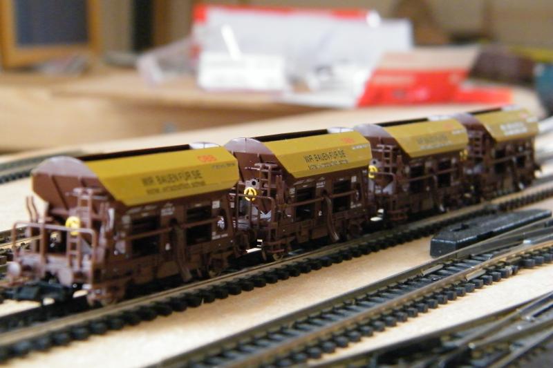 Maar helaas hangt de camera op het moment aan de lader,dus komen de foto's met de nieuwe geweatherde staalwagens van de FS en de nieuwe Vleeschmanns set met onderlossers Wir bauen fur Sie later.