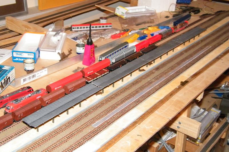 Behoudens het aanbrengen van de gaas rond de betonnenvoeten,ben ik vanavond ook nog bezig geweest met het laatste en vierde deel van de perronoverkapping te plaatsen.