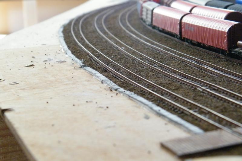 Bij jouw moderne tijdperk past onkruid tussen de ballast wat minder. Misschien heel spaarzaam iets met groenturf of wat grassprieten proberen. De afwisseling krijg je eerder door wat direct buiten de sporen ligt, de groenstroken/randen met wat laag struikwerk, bosjes, uit de kluiten gegroeid gras. Probeer eens zo'n stukje aan te kleden en kijk dan eens of je op die manier het steriele idee kunt kwijtraken.