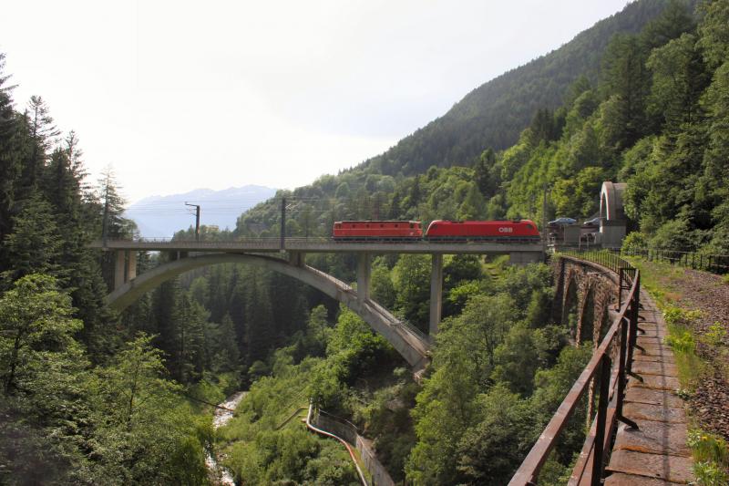1044 040 und 1116 040 mit Güterzug am 26.05.2007 am Kaponiggrabenviadukt. Im Vordergrund ist die alte Trasse der Tauernbahn zu erkennen.