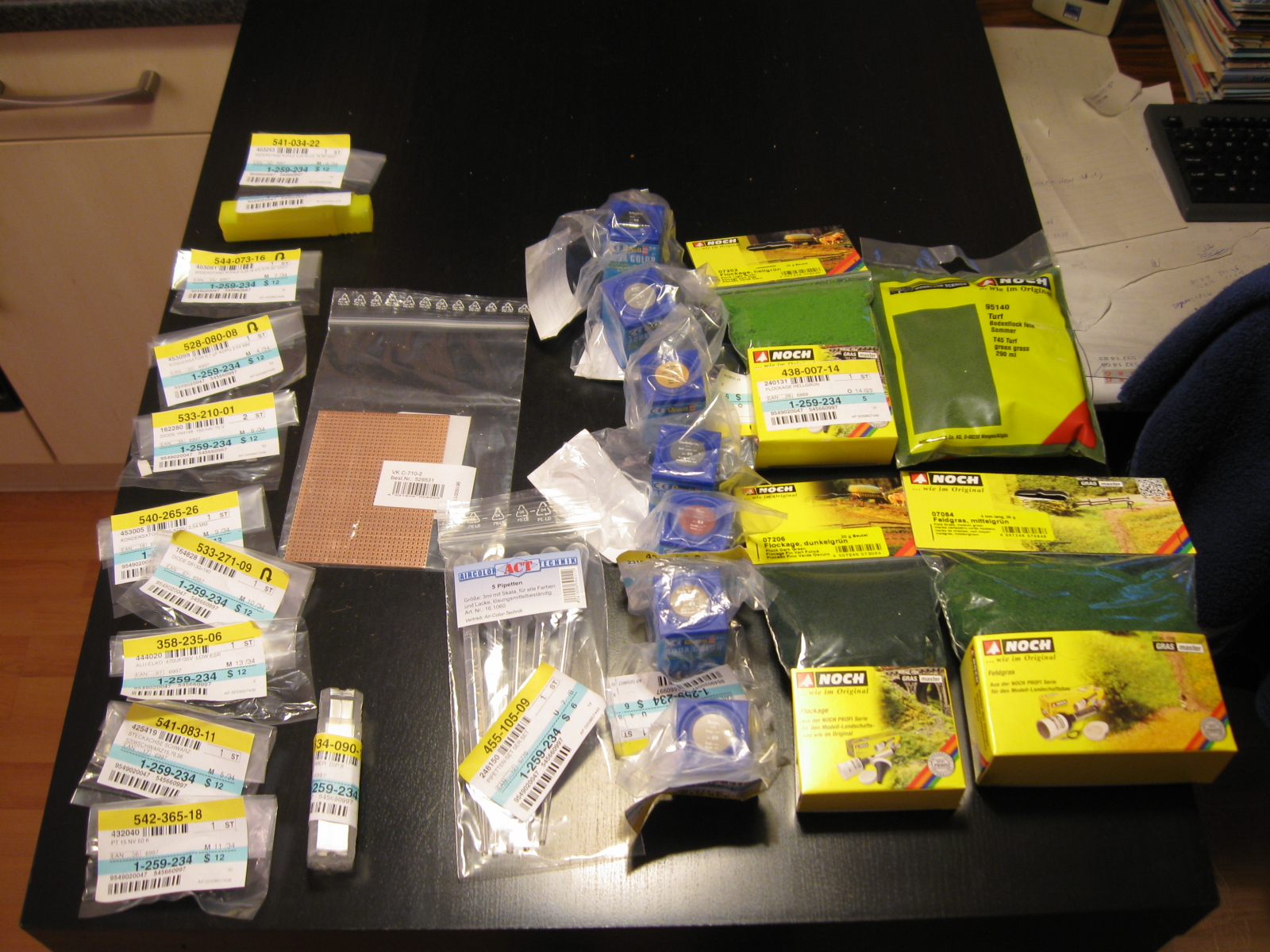 In het pakket de elektronica voor de PWM schakeling, Revell aqua color, pipetten, begroennings materiaal.