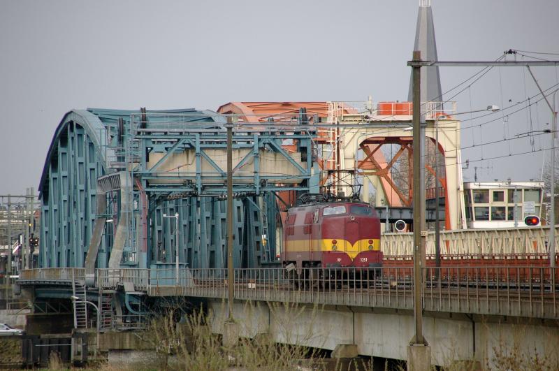 Hier de loc op de IJsselbrug te Zutphen, apart is dat de hefbrug voor het auto/fietsverkeer al omhoog is, ivm passeren van een boot, terwijl de hefbrug voor het treinverkeer nog naar beneden is.