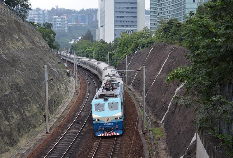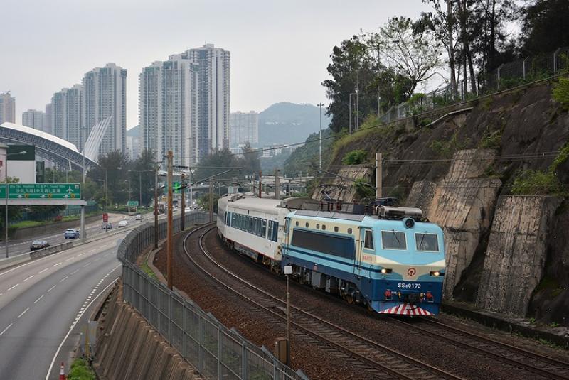 Chinese Railways SS8 0173 met trein T808 Hong Kong-Guangzhou. Op de achtergrond is de bebouwing van Fo Tan zichtbaar, links de overkapping van de tribune van de paardenrenbaan waar in 2008 de hippische onderdelen van de Olympische Spelen plaats hebben gevonden.