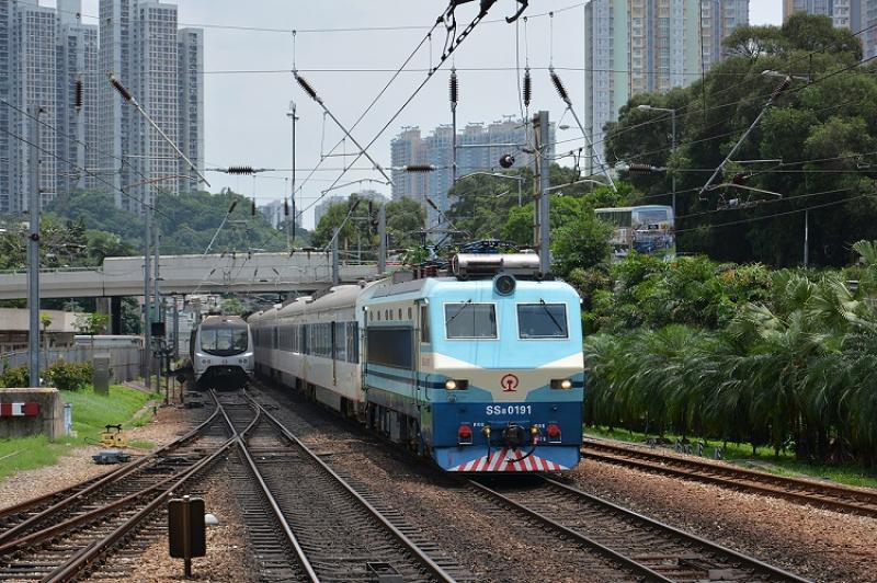 Chinese Railways SS8 0191 met T813 Guangzhou-Hong Kong dendert door Sha Tin, de metro was gelukkig net op tijd weg...