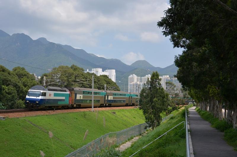 TLS 002 rijdt voorop met de Ktt-trein T826 Kong Kong-Guangzhou, net voorbij de halte University.
