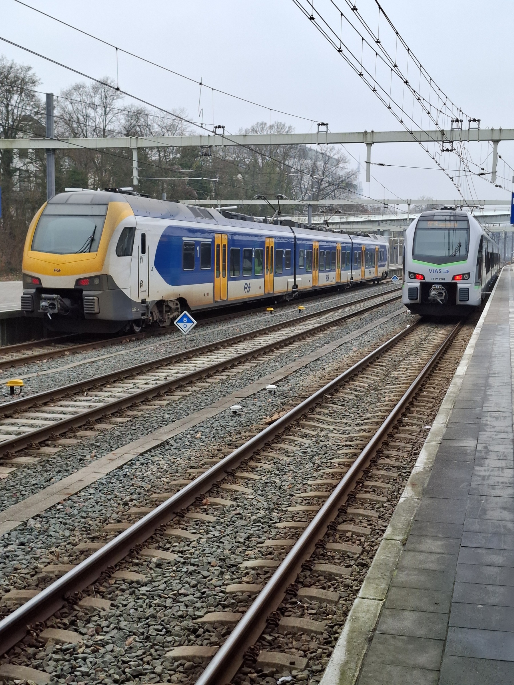 Flirt treffen op Arnhem Centraal. Links als NS sprinter richting Nijmegen. Rechts als Vias RE19 pendel naar Emmerich (waar op Gleis 4 overgestapt kan worden op een eenspannings Flirt naar Düsseldorf Hbf.)