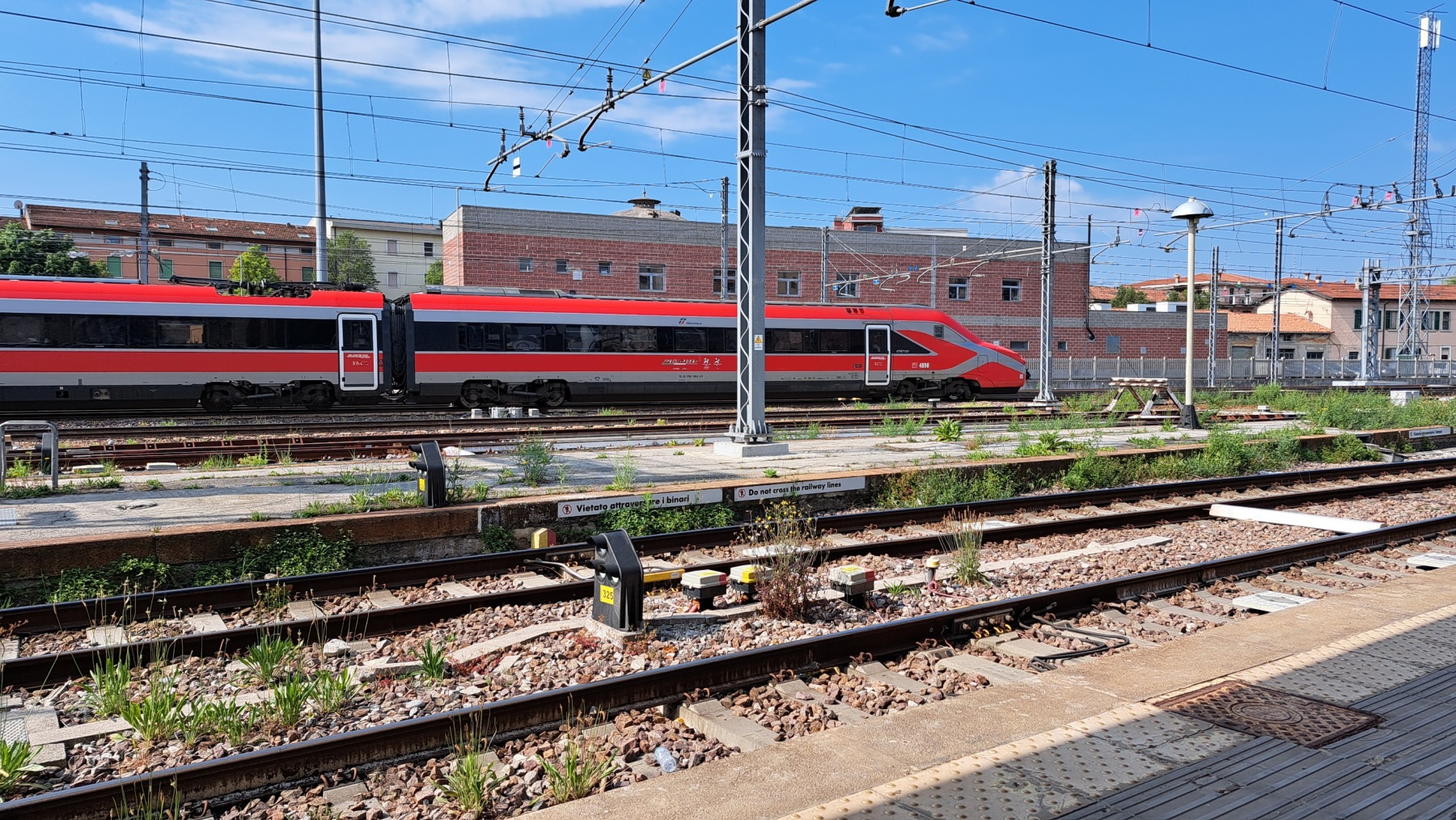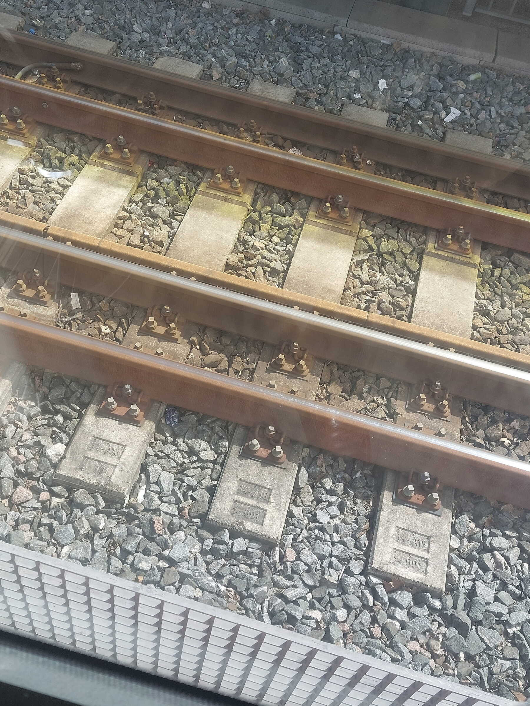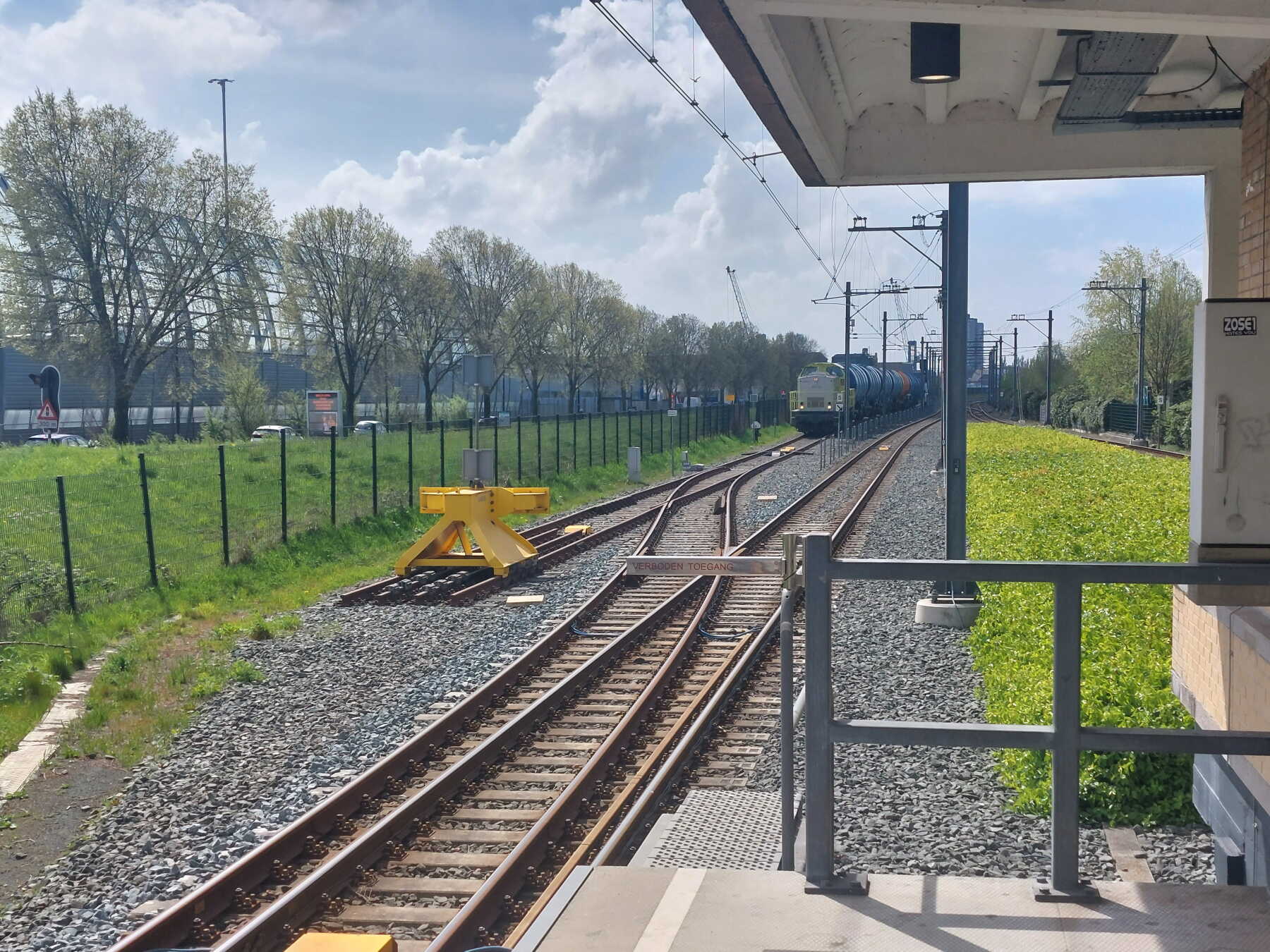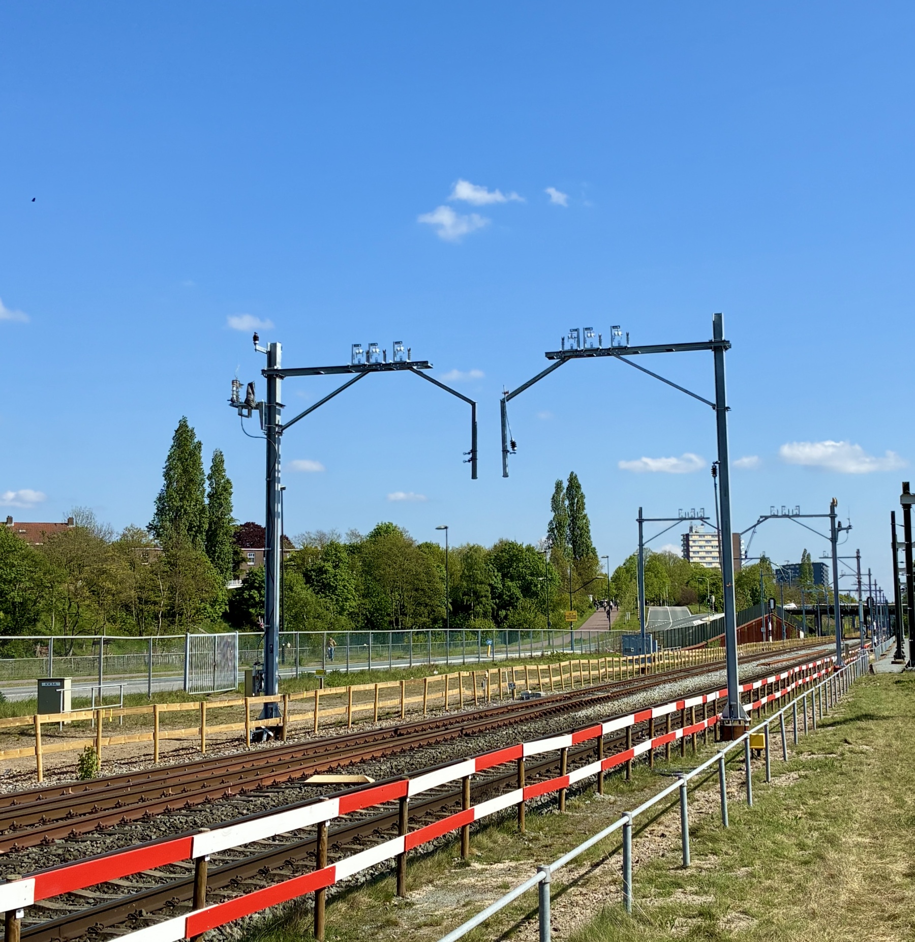 De nieuwe bovenleidingsmasten aan het begin ( of het einde) van de Maaslijn.