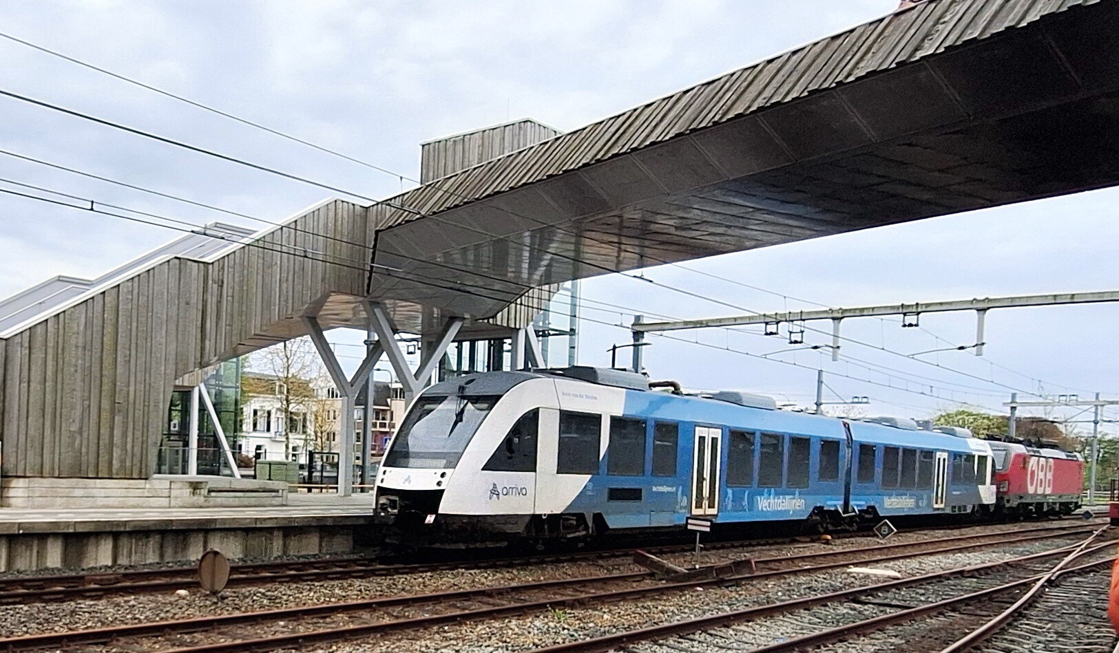 Passage om 13.24 uur in Dieren; een LINT uit Zutphen op sleeptouw van een OBB Vectron richting Arnhem-Emmerich.