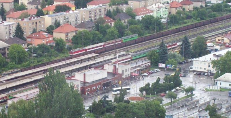 In Trençin was meer te beleven, veel personenverkeer en een grote goederentrein met tientallen open bakwagens: werd ik zomaar van het station weggestuurd met m'n camera! Dus op het hoge kasteel geklommen en het hele emplacement vanuit de lucht vastgelegd. Hier een uitsnede van de panoramafoto:
