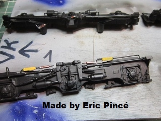 Dan natuurlijk de draaistellen verder afwerken en vervuilen, eens dat is gedaan de body nog voorzien van een paar kleine details (te schilderen), dan kan de body op de chassis vast geschroefd worden met de voorziene lange boutjes. Dan de decals opzetten en dan wat vervuilen