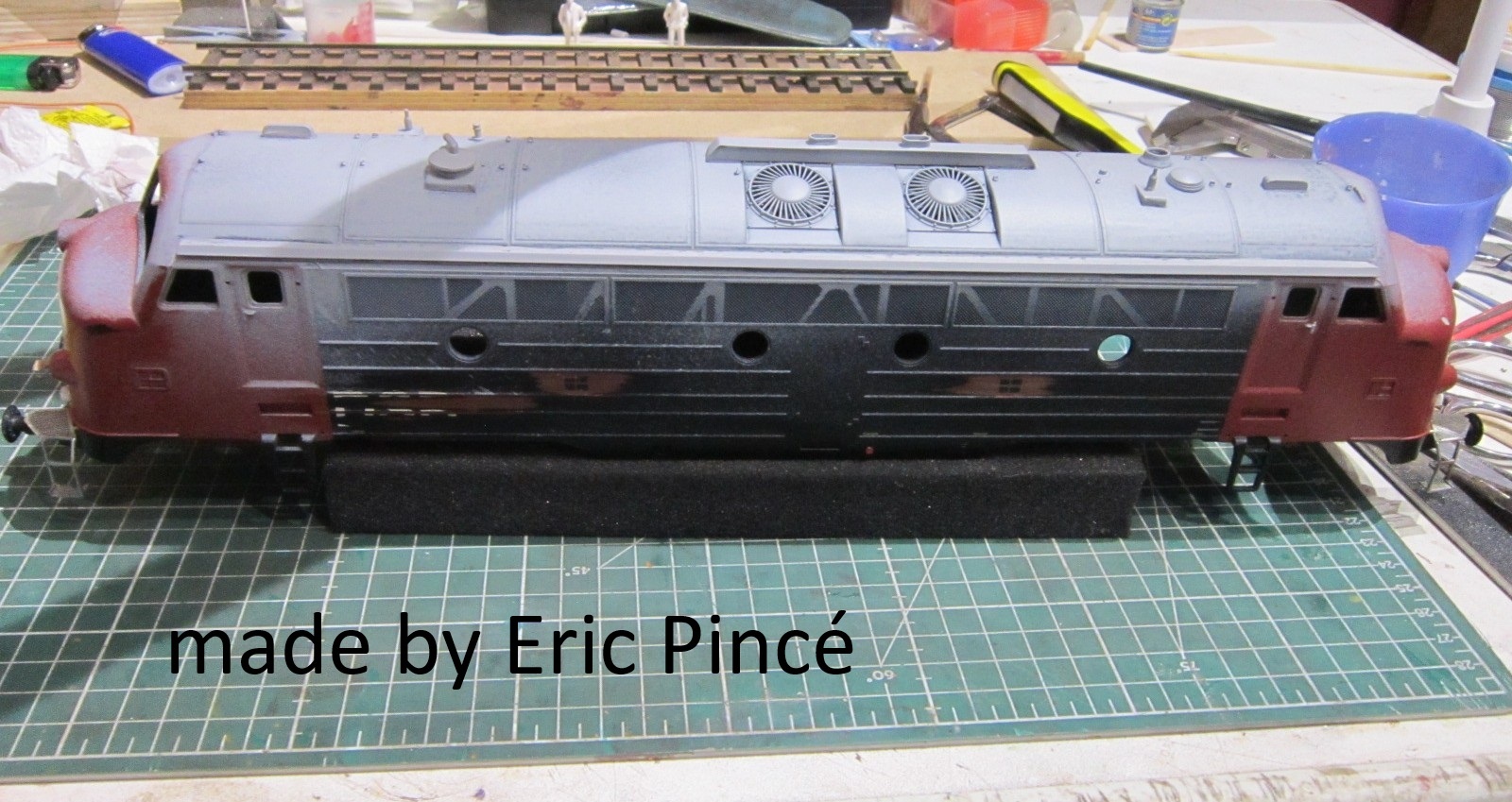 Nog 4 te gaan en dan zijn het de gaatjes afbramen aan binnenzijde van de body. Ook 2 vierkante claxons zelf ineen flansen dat gaat moderner zijn bij deze locomotief, het zal een beetje met de "natte" vinger worden om dat te doen, vind er niet teveel van terug.