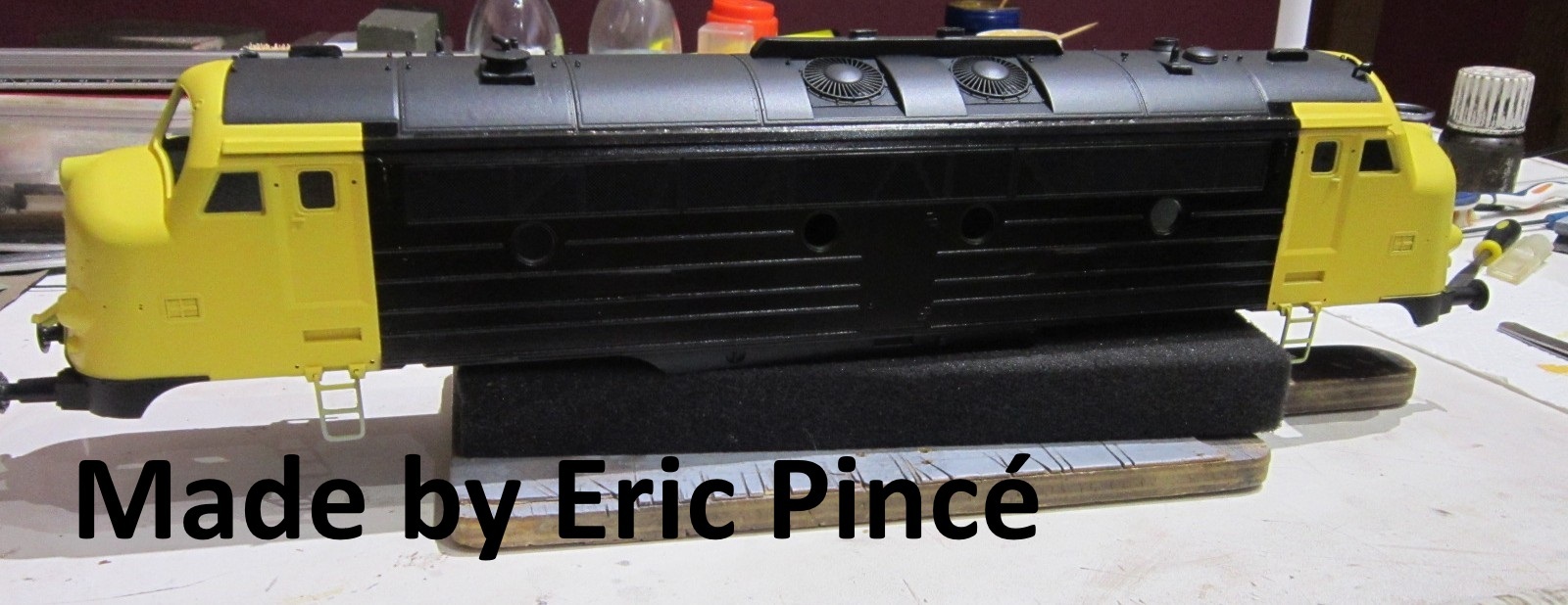 Vergeten onderdeel is reeds gemaakt en in de verf gezet, na drogen reeds onderaan de chassis verlijmd. Dus een zorgske minder. Deze morgen laatste spuitwerkje gedaan aan de body, nu na laten drogen de binnenkanten eens aanpakken voor verdere afwerking en plaatsen van de cabines.