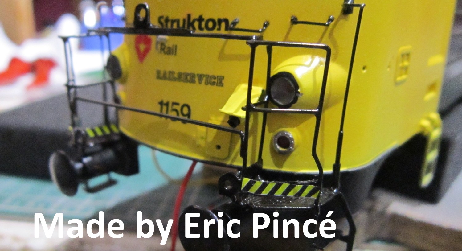 Decals op de frontkant geplaatst alsook op de rangeerderplatforms met geel/zwarte strepen, kleine handsteunen op de neuzen gezet en dan de 4 sierslangen afgewerkt waarvan er reeds 2 zijn bevestigd op de achterbufferbalk.LED nog plaatsen op de voorzien plaatsen en dan draden aan de stekker solderen (+ testen natuurlijk)