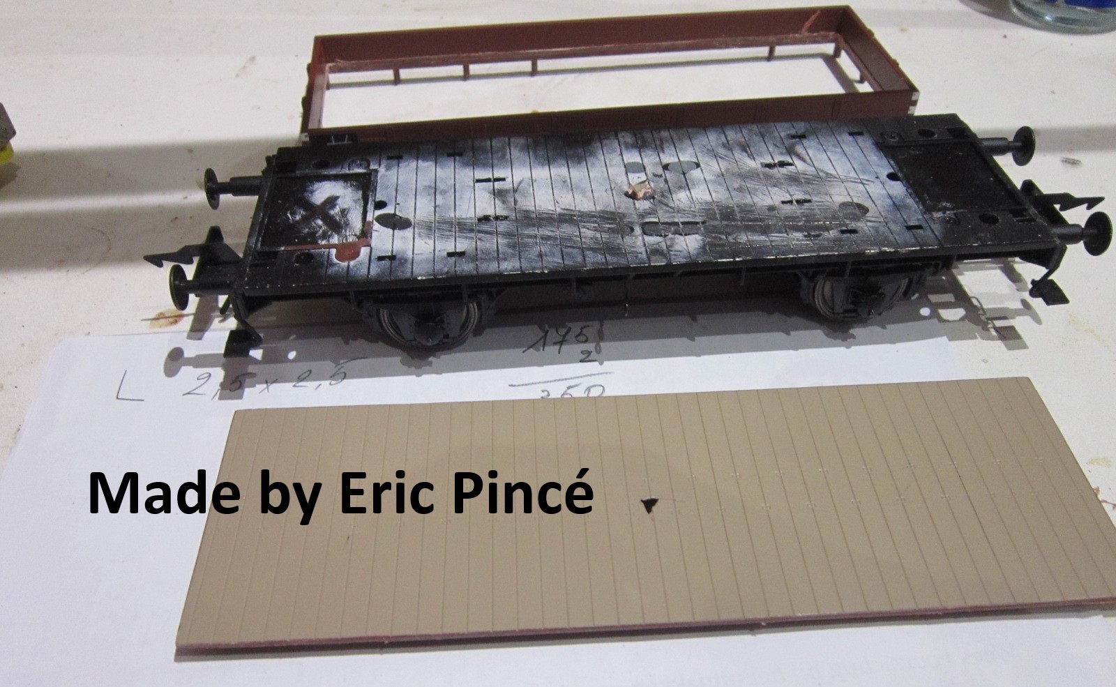 Platte wagon uiteen gedaan, losgesneden zijwanden zodat enkel platte onderkant overblijft.
