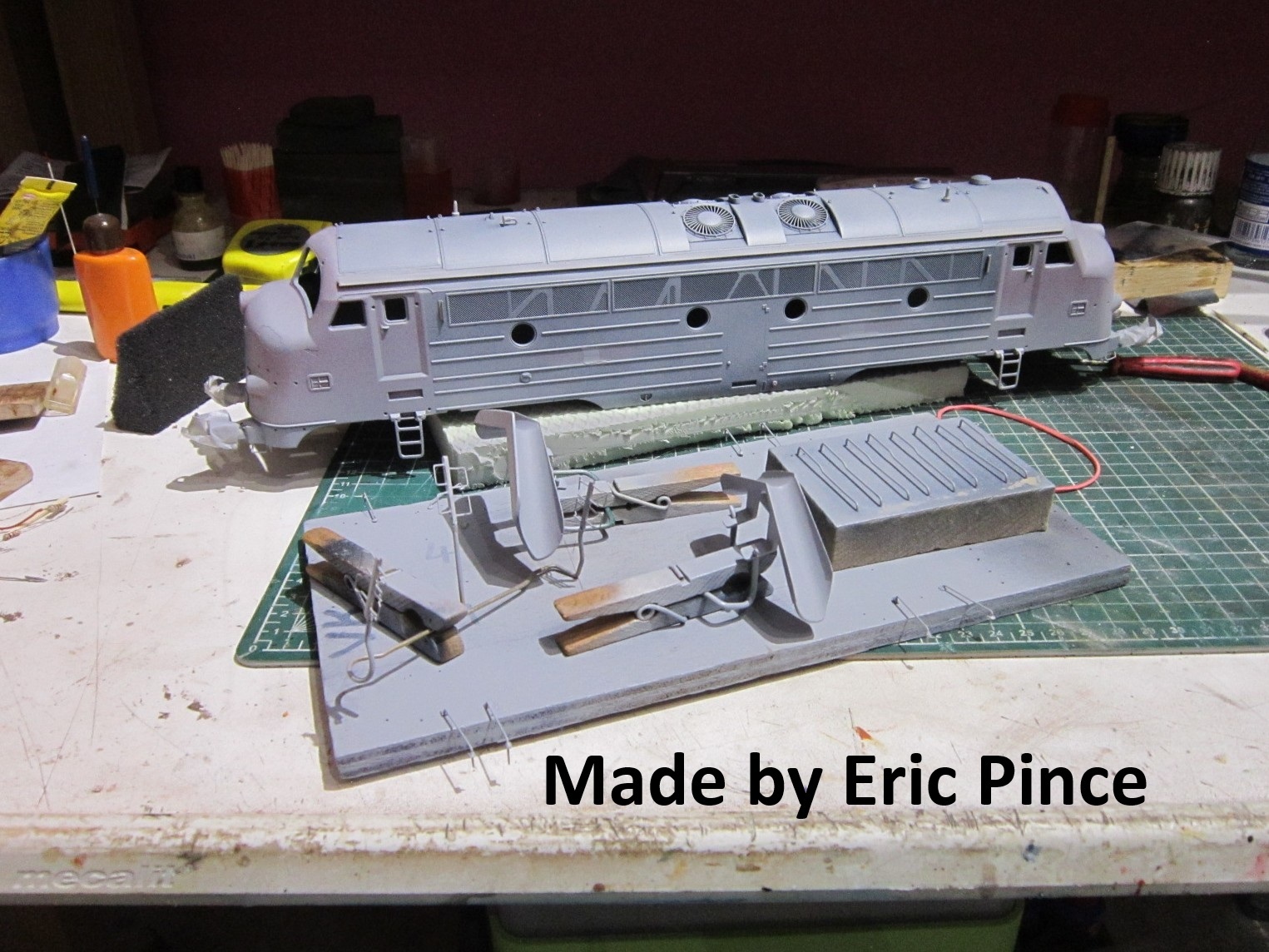Dan nog aan de body de decals verwijderen, richels maken voor aan dak, de voetsteunen op de neuzen zetten, relingen plooien en voorzien van de plaketjes.