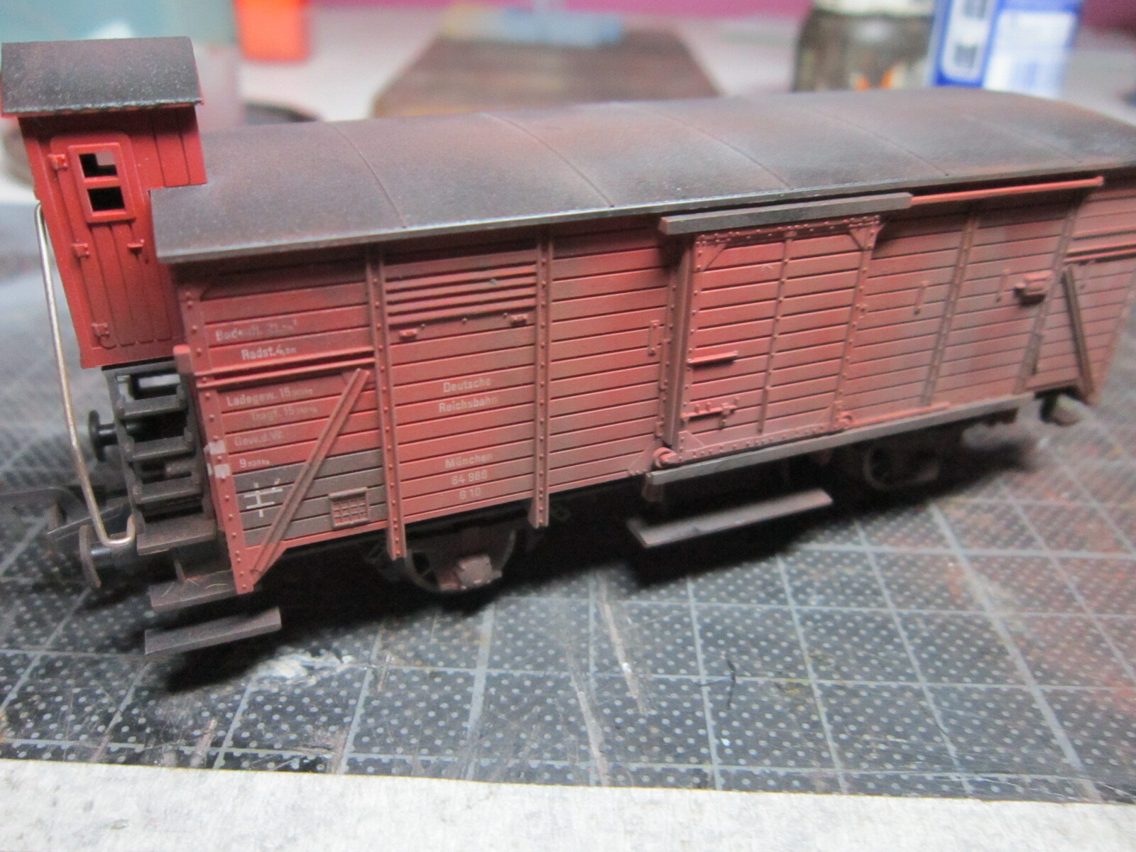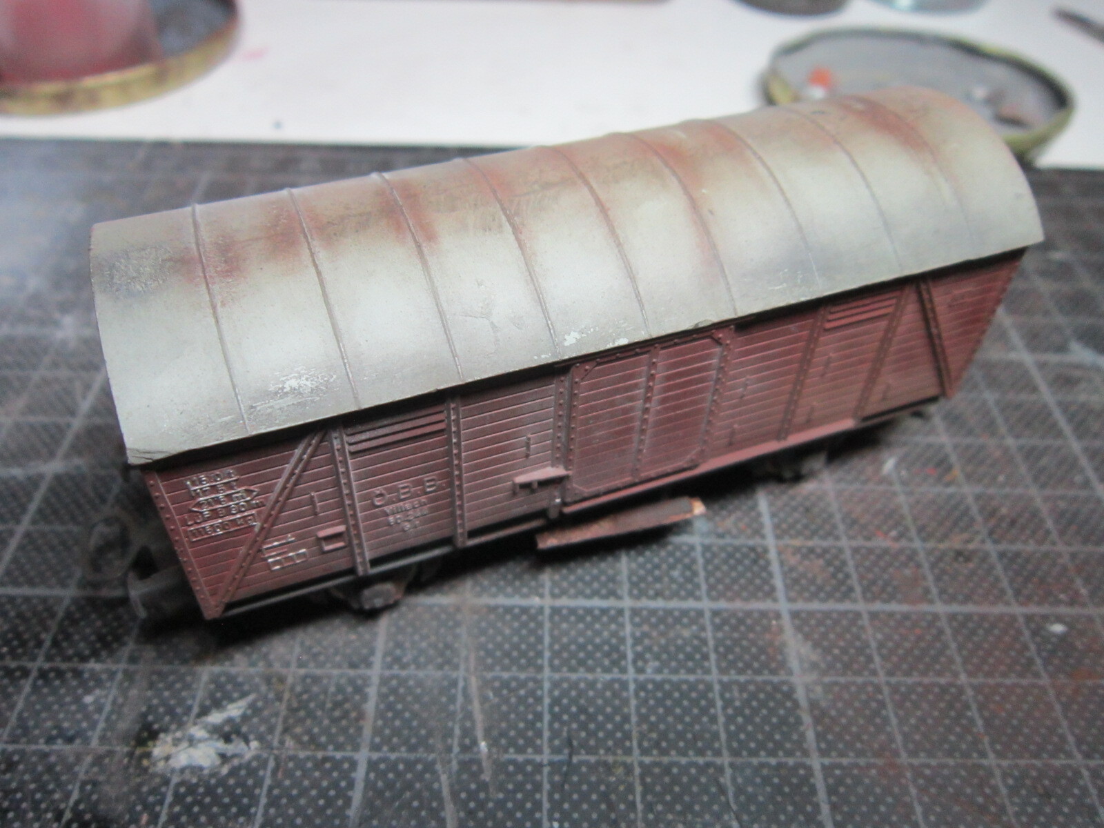 Begonnen aan het werkje voor Eric uit de wijk, 4 goederwagons, 2 rijtuigjes en een dikke stomer vervuilen. Het is Ho en das lang geleden dat ik dit nog gedaan heb. Hij heeft al komen kijken en tis goe genoeg veur den dienst. Komt snor. Hoop deze week wel alles terug te kunnen afgeven, das dan weer een zorg minder .