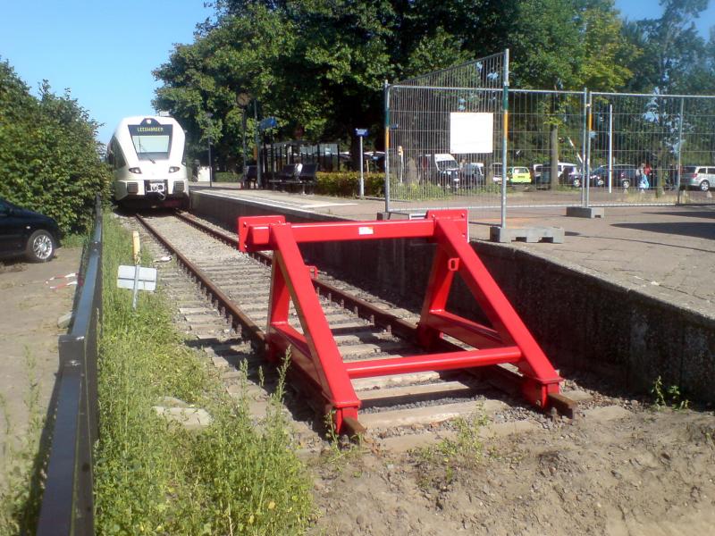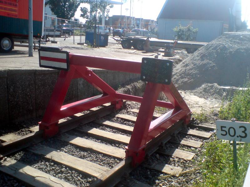 Het vernielde gele Rawi-juk is vervangen door een rode Fixstop. De rijlengte van de spoorlijn is daarmee rond 1,5 meter verlengd  ;D want je ziet de paaltjes nog staan naast het spoor waar het vorige juk stond.