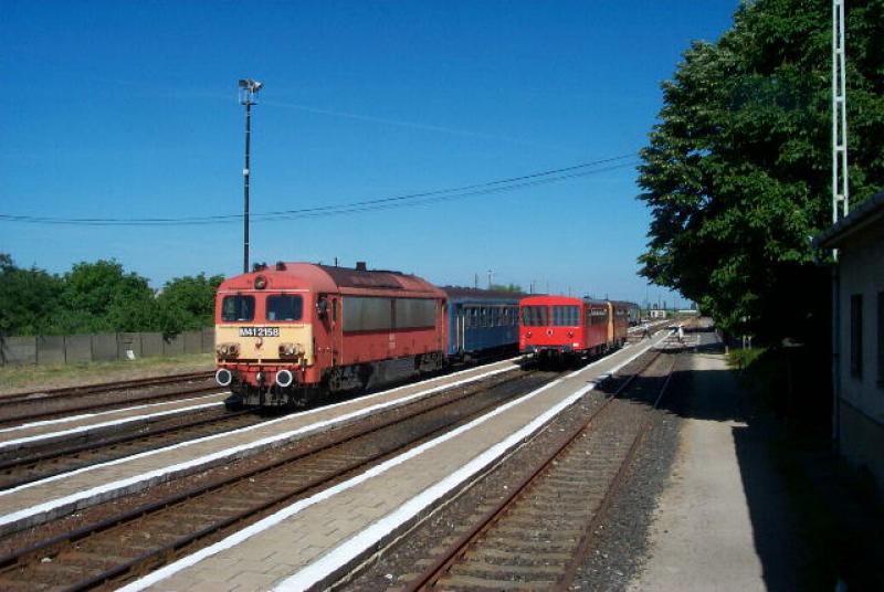 De 2158 vertrekt met een semi sneltrein vanuit station Tiszafured.