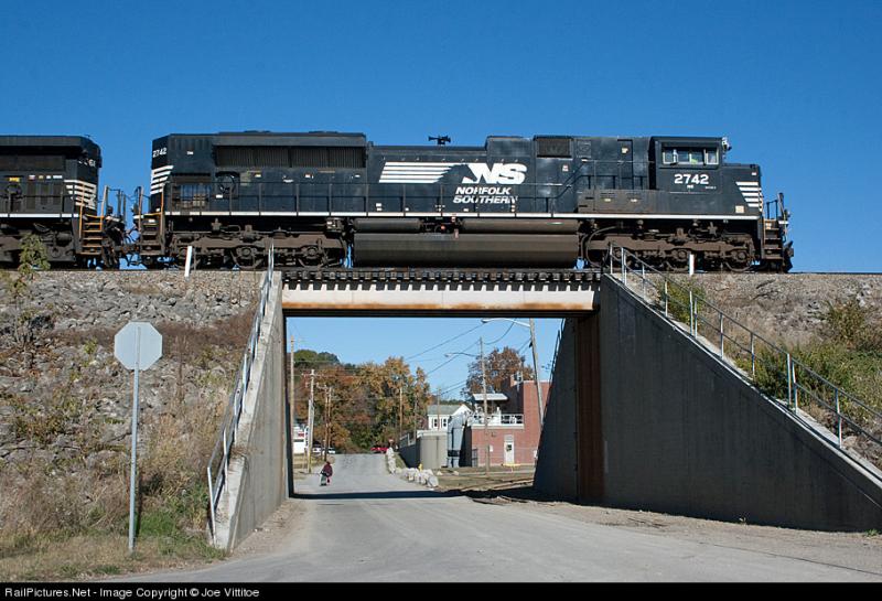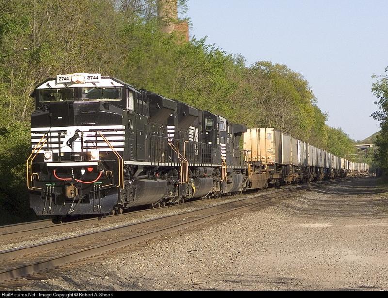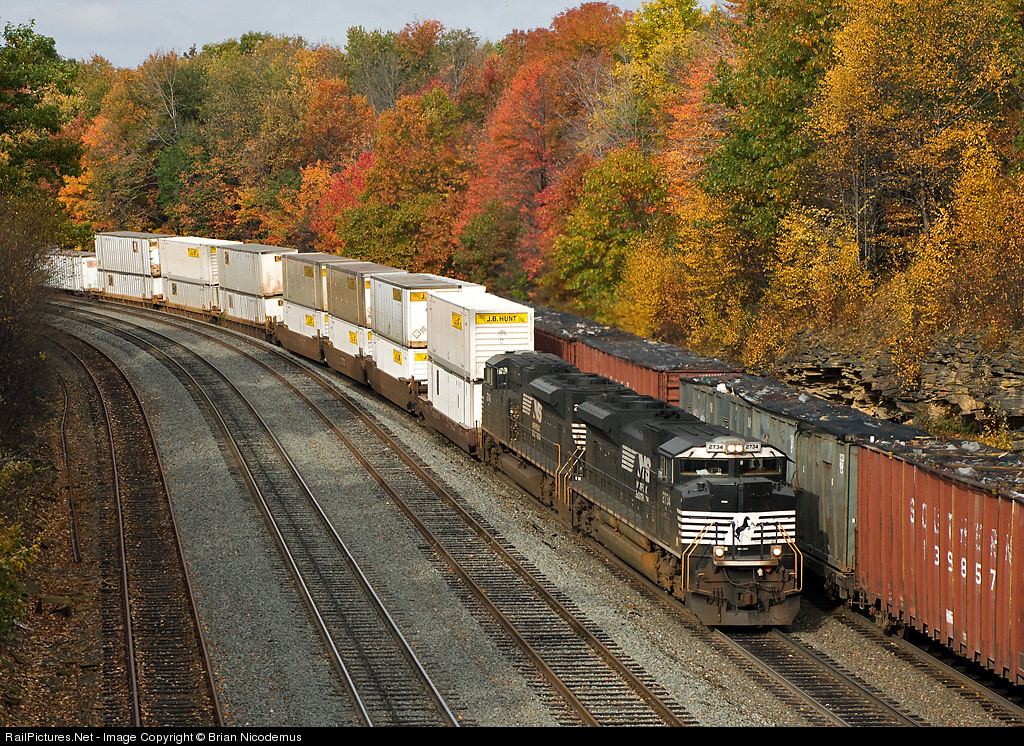 Eastbound stacks meet a westbound manifest at the RT 53 overpass near Cresson, PA on the Pittsburgh Line.