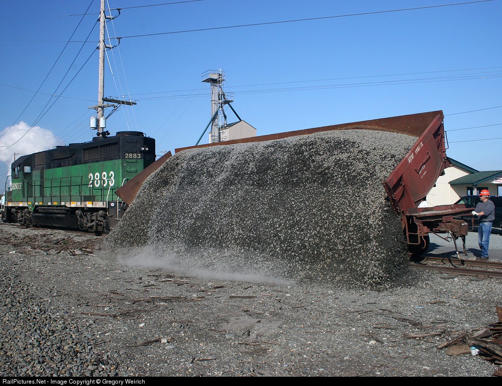 Een lading wordt gestort vlak achter BNSF 2883. Het gaat om "yard ballast" die gebruikt zal worden voor een wissel die wordt vervangen.