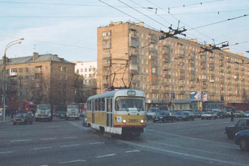 Tatra T-3 #2881 at the crossing of Tikhvinskaya Street and Third Ring Highway, Moscow, 15 October 2002