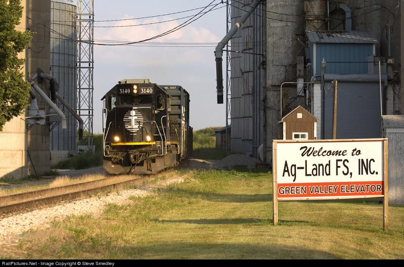 Burlington Northern 3148 voor een legen vuilnis trein. De vissers in het bootje zitten waarschijnlijk nog niet ver genoeg weg om de stank te kunnen ontwijken...