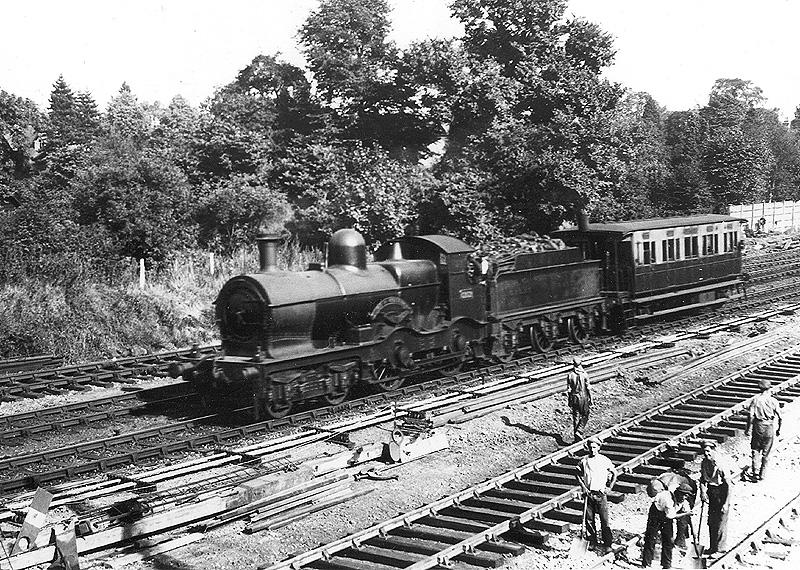 GWR 4-4-0 No 3252 'Duke of Cornwall', the founding member of the class, is seen with an inspection coach during the quadrupling of the lines near Knowle and Dorridge. The new track was laid to the south of the existing trackwork as can be seen in this photograph. C1934-6 Built at Swindon works in May 1895 it was superheated in July 1923 requiring a longer smokebox and remained in service until withdrawn from Aberystwyth shed in August 1937 to be scrapped at Swindon works soon afterwards.