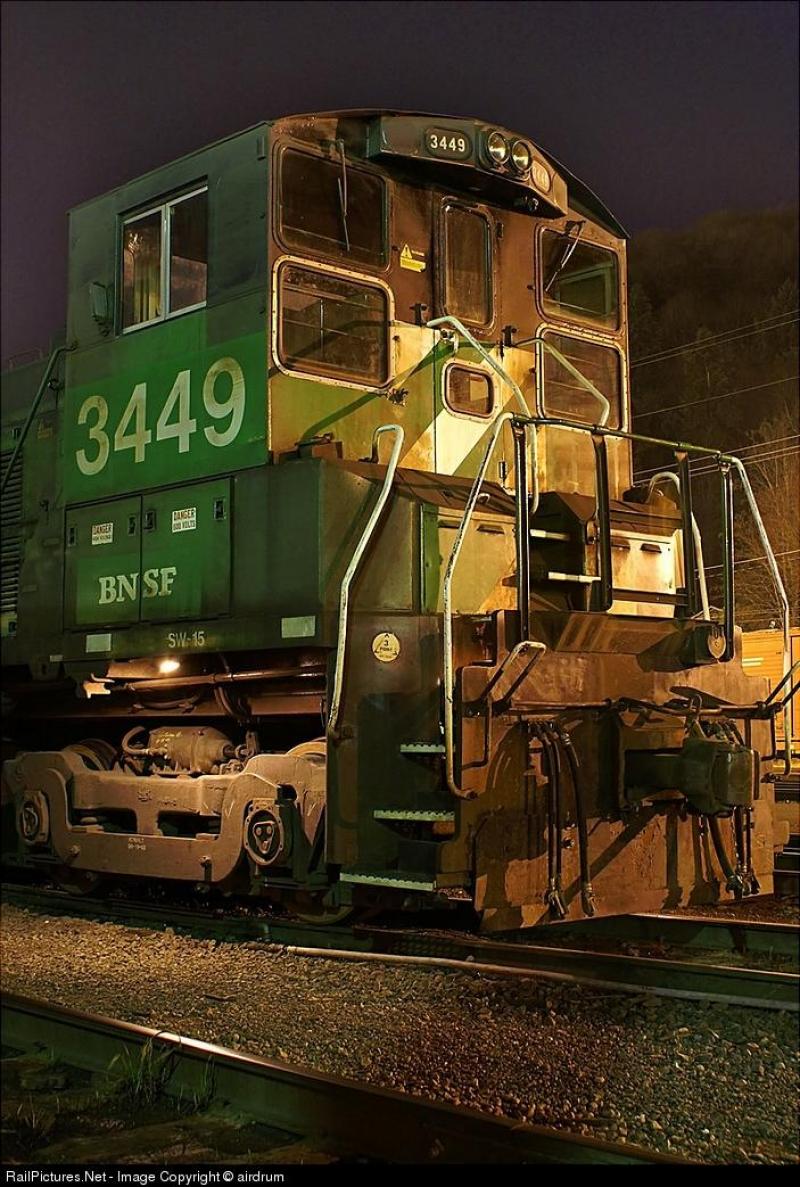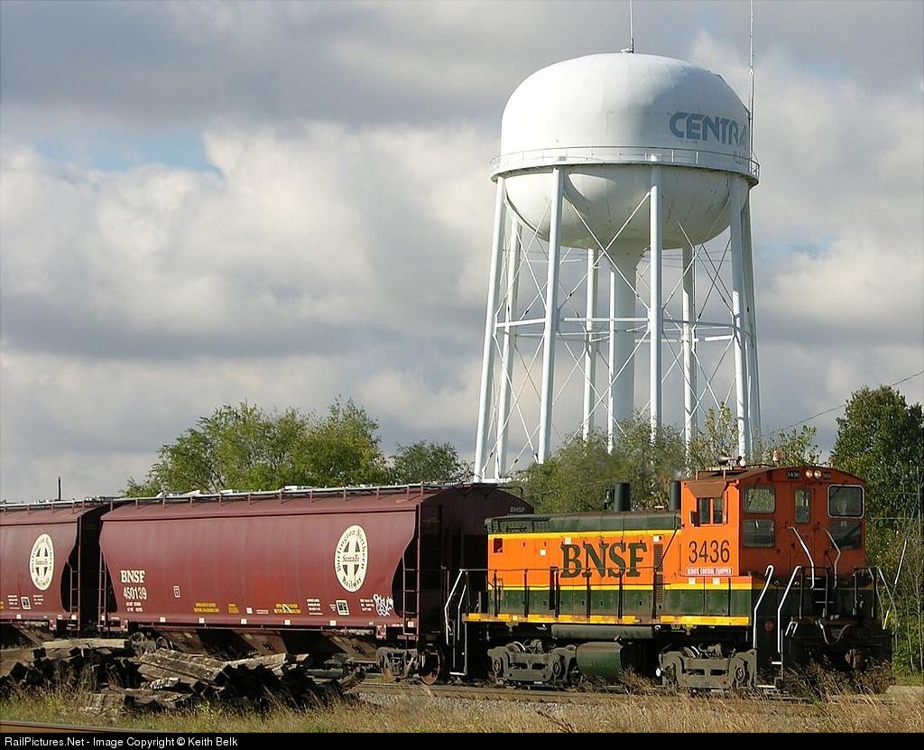 BNSF 3436, een rangeer loc van het type SW1500, aan het rangeren voor een voedsel bedrijf.