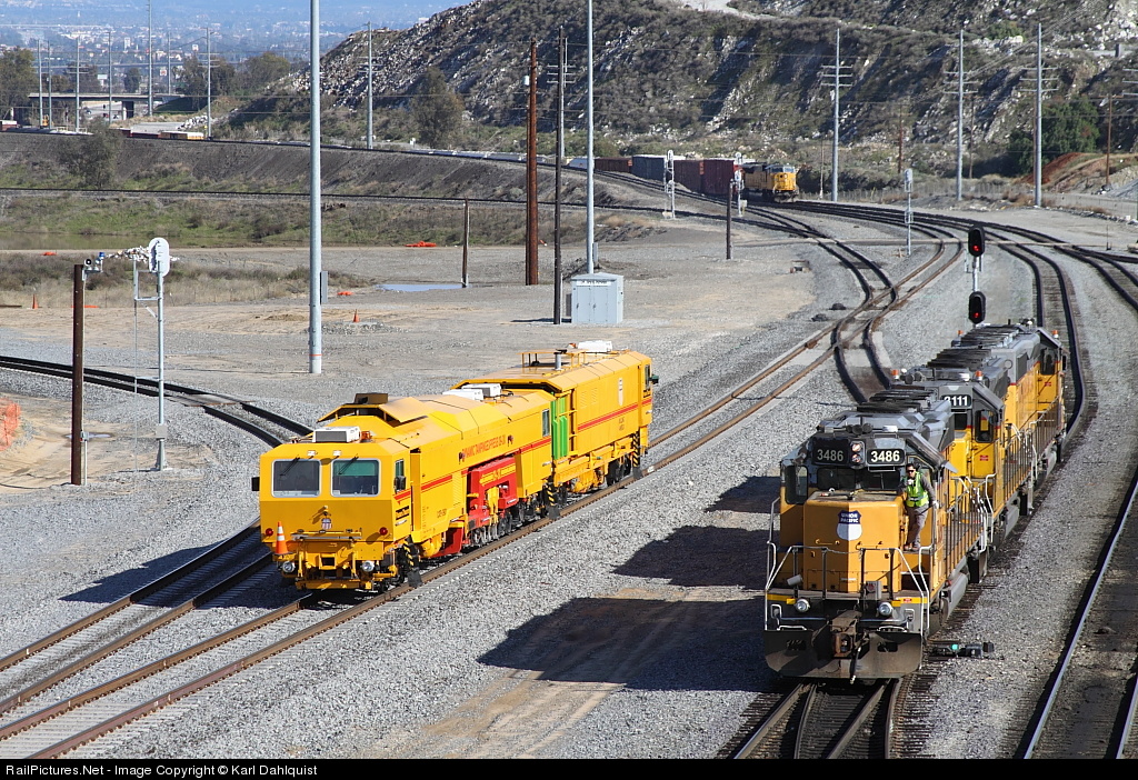 De DynamicTamping Express 09-3X last haar hoorn horen aan Union Pacific 3486, 3111, 3108 (SD40-2s) op de West Colton Yard in Californie.
