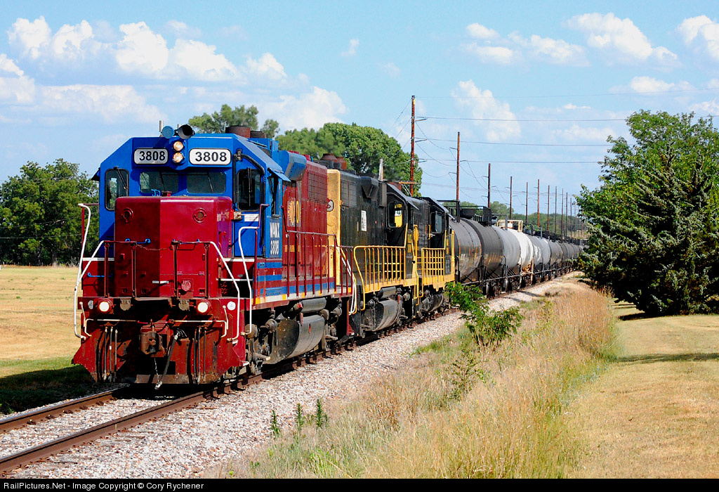 Kansas & Oklahoma Railroad 3808 bij Hickory Road, Hesston, Kansas, trekt een sleep tankwagons uit "Emma Creek valley" in Hesston op de terugreis naar McPherson