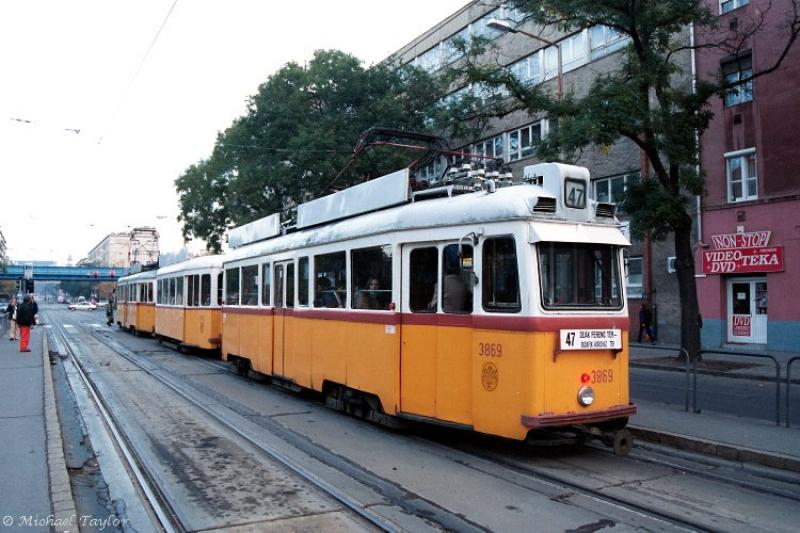 Budapest.UV5 car 3869 at Fхvбrosi Mьvelхdйsi Hбz with a Pest-bound 47 service on Monday morning, October 27th, 2003.