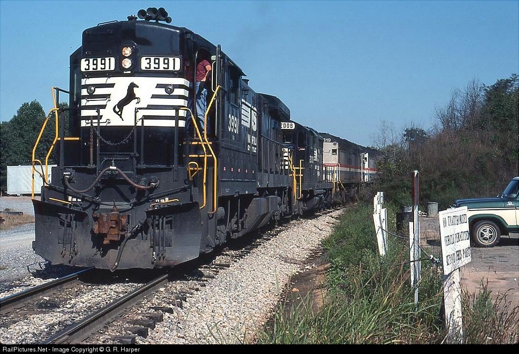 NS 3991, een GE B23-7 lokomotief voert een ten gevolg van een botsing gestrande Amtrak trein af.