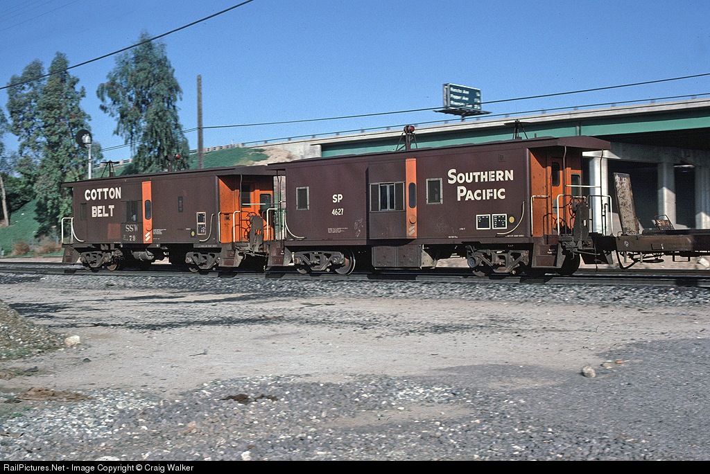 deze keer. De Southern Pacific C-50-7 caboose 4627 staat samen met Cotton Belt C-50-5 caboose 79 te wachten op het eastbound track bij Colton, California.