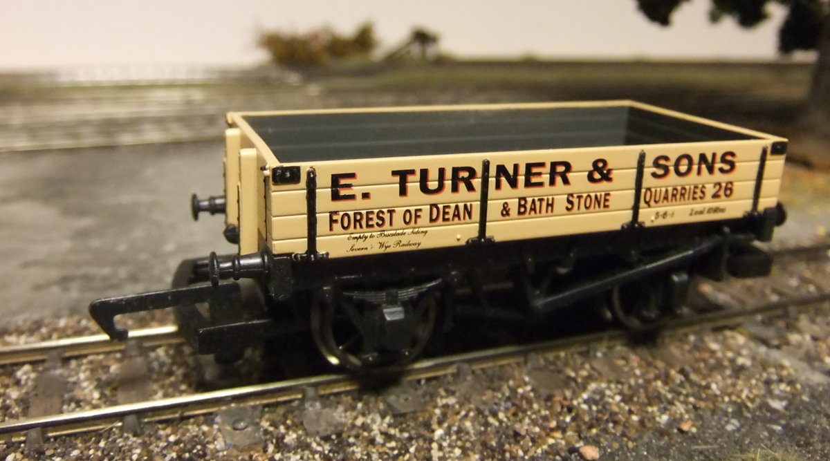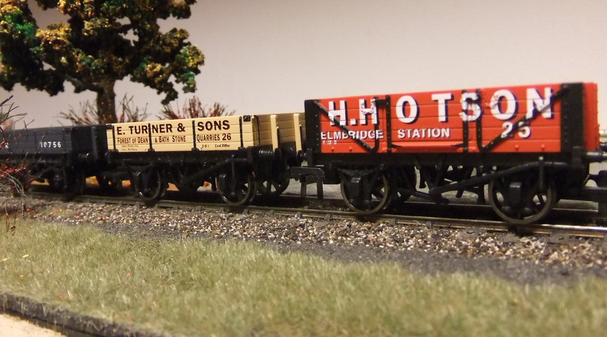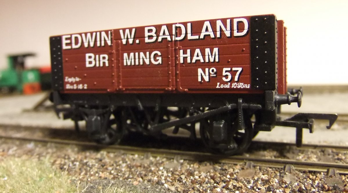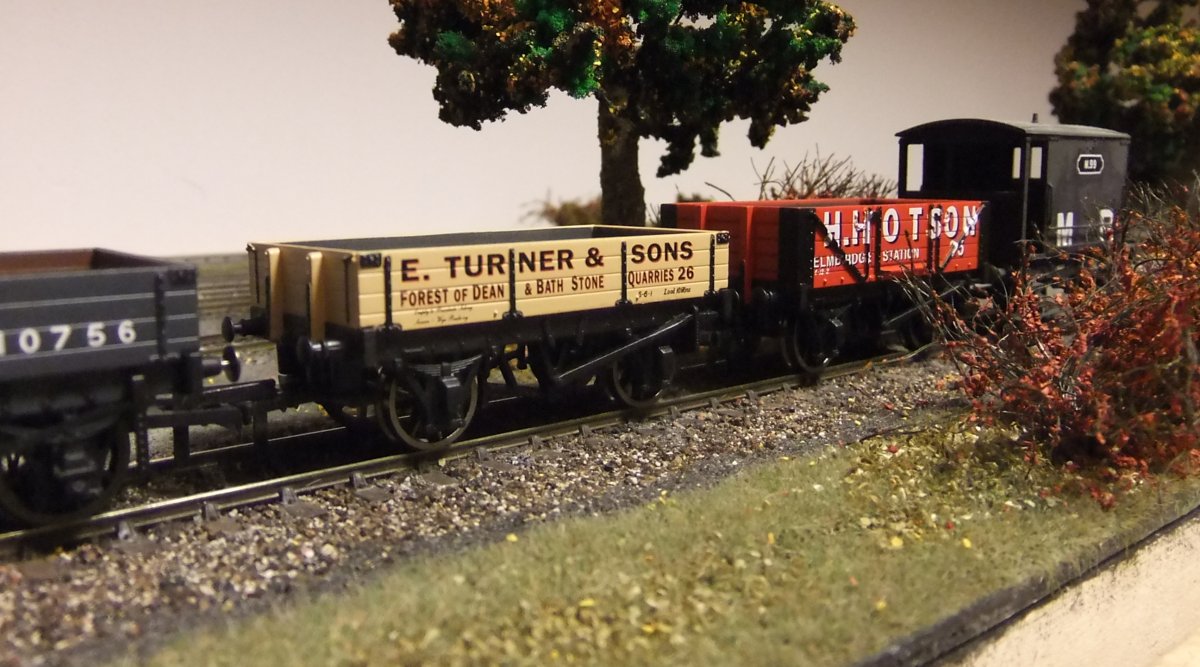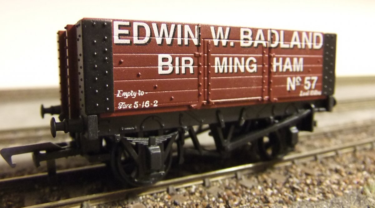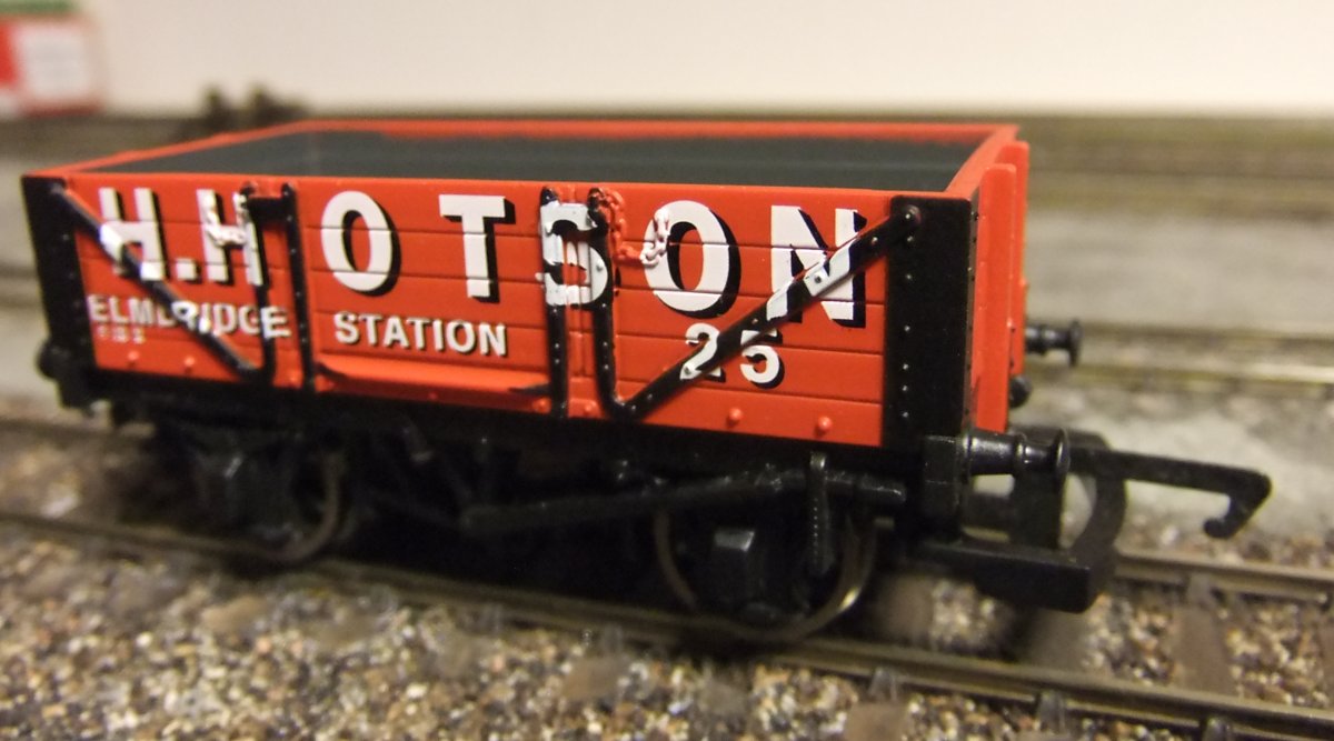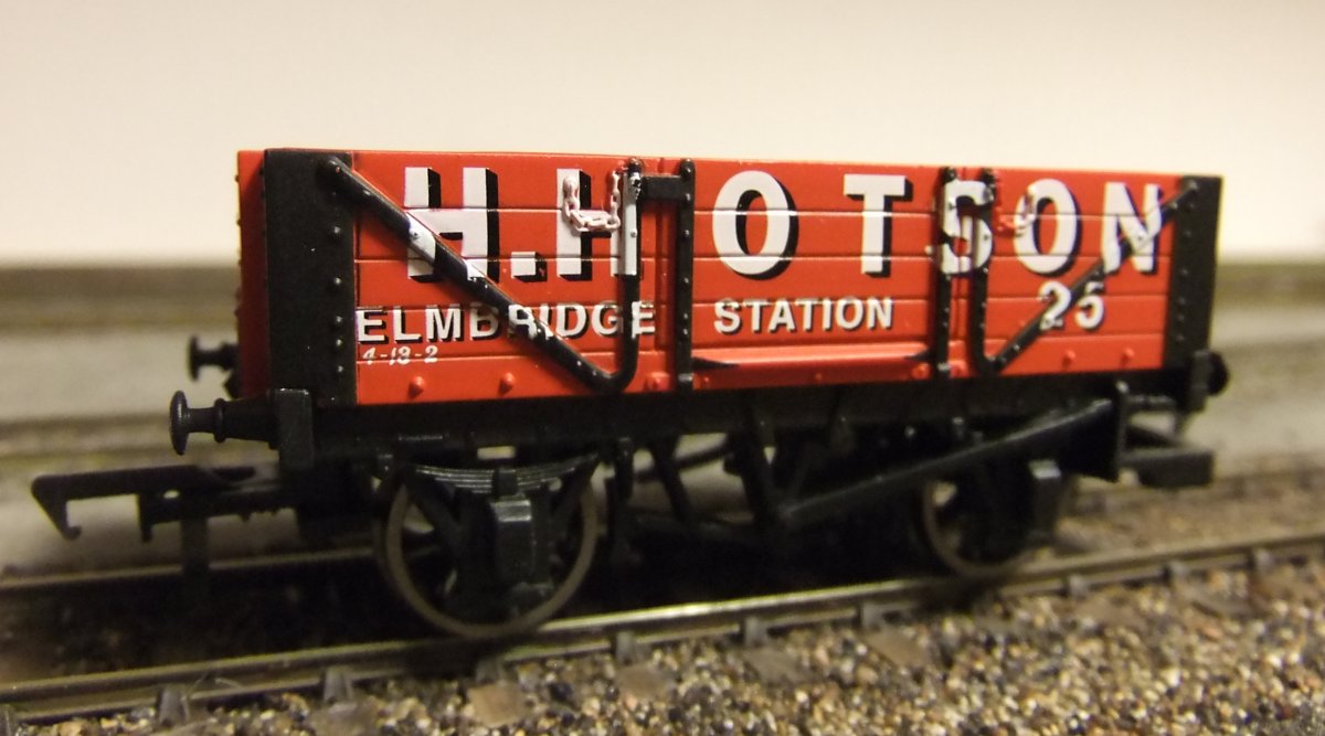 De 7-plank wagon van de foto uit de post hiervoor moet een RCH 1923 type wagon voorstellen. Daarvoor schijnen ze een ex-Airfix bakje te gebruiken op een nieuw onderstel. Volgens mij hoort de bak 16' 6" lang te zijn, maar lijkt hij op de foto iets van 18 ft. te zijn. Het onderstel, wat een 9 ft. wielbasis moet hebben, heeft van Hornby een 10 ft. wielbasis meegekregen. Dat is allemaal niet erg prototypisch, maar het ziet er goed uit, en ik denk dus dat we daar wel mee kunnen leven.