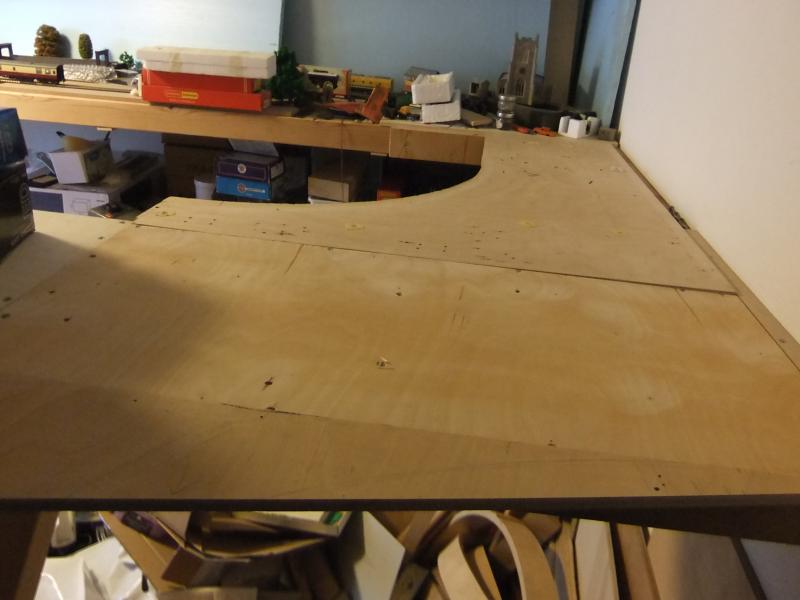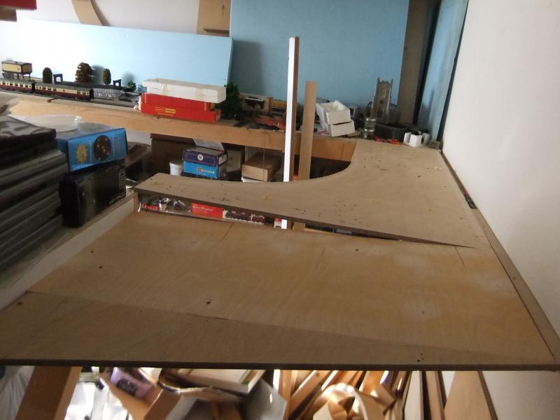 Vandaag weer eens aan mijn baan gewerkt, nl. de laatste module die ik nog moet maken. Hij moet èn opklapbaar zijn èn precies ergens tussen passen +/- ca. 1mm en hij is ook nog eens niet recht, maar L-vormig en ik vind het ku....  ehh  :-[, heel moeilijk en zo, dus stel ik het maar steeds uit om andere dingen te doen. En zo heb ik na weet ik hoeveel jaren geen baan maar wel een tafel die niet klaar is met allemaal zooi erop :-[