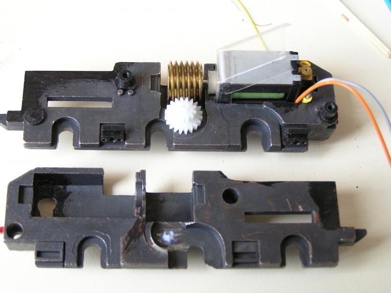 Een van de motorcontacten van deze motor is verbonden met het grote gewicht naast de motor. Die verbinding kan misschien blijven zitten, maar dan mag het gewicht niet in verbinding staan met de wielen. Voor de andere verbinding zit naast de motor een koperen stripje wat naar de onderkant van de motor toeloopt.