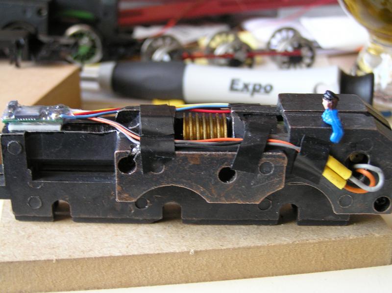 Ik heb voor mijn Bachmann een stukje van 3mm dik van het voorste (links op de foto) deel van het chassis afgeslepen met een slijpschijf, en daar een kleine TCS M1 decoder vastgeplakt met dubbelzijdig tape. Ik weet dat het nog vrij lastig was om een veilig  pad voor de draden naar de motor te vinden. Het slijpen ging makkelijk want het frame is van is zacht pisbakkenstaal, dus zou het met een beetje vijl ook nog gaan.