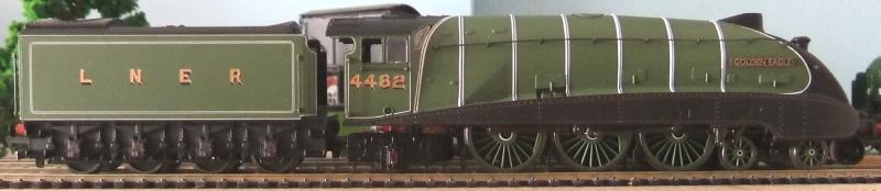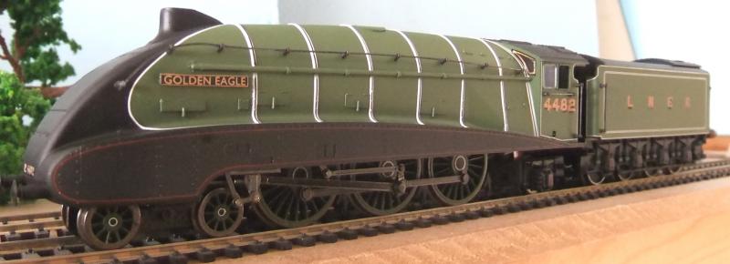 Er waren in het echt ook maar 4 zilveren A4's, het waren de vier eerste die gemaakt zijn. LNER groene waren er ook een paar, Golden Eagle is zowel door Hornby (3-polige tender drive) en Bachmann (split framed chassis) in het LNER groen uitgebracht. De meeste waren Garter blue. In WW2 werden ze zwart geverfd en later kwamen er de BR uitvoeringen in het blauw en brunswick groen. Ze werden toen ontdaan van hun "valances" en waren dus met hun korte rokjes de tijd ver vooruit.