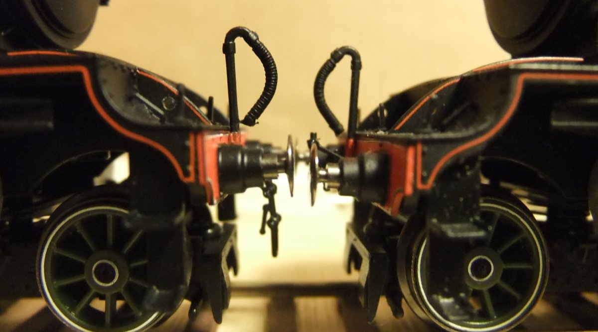 Hier zie je de beide Book Laws met de voorste buffers tegen elkaar aan. De originele "goeie" van Hornby staat links en de door mij bewerkte staat rechts: