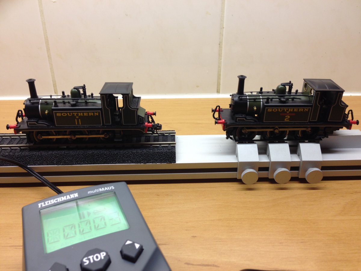 Heb de Flying Scotsman opgelost. Stukje plastic onder het loopwiel geplaatst waardoor het nu eigenlijk boven de rails zweeft. Iets de dik. Verander ik nog wel eens. Maar hij rijdt nu probleemloos door alle bochten en wissels. Tada!