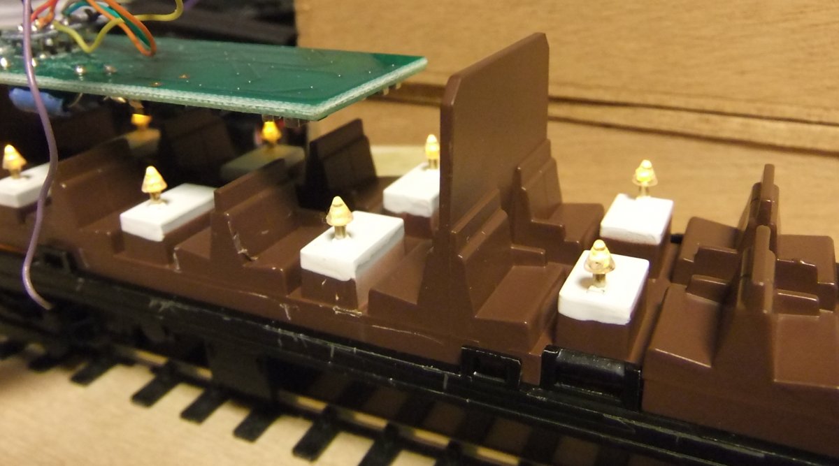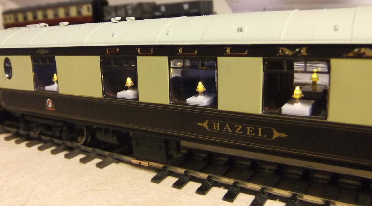 De aanpassing zit hem dus alleen in de koppeling en de wijze waarop de lampjes op afstand aan/uitgezet kunnen worden. Interessante optie, óók voor de getrokken Pullman of Maunsell coaches. En een uitdagend klusje voor de EMV. We hebben inmiddels heel wat rijtuigjes waar nog helemaal geen licht in zit.